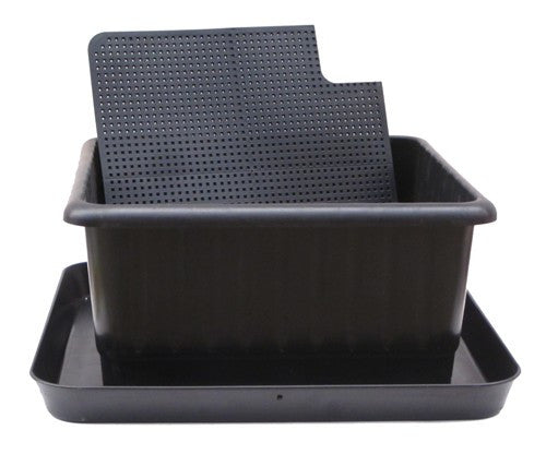 The sub-irrigation watering container has 3 pieces: saucer, pot, and soil separator, made from a blend of recycled and virgin plastic here in the USA. Water into the saucer at the bottom and the soil and roots wick the water up through the soil separator to feed the plant.